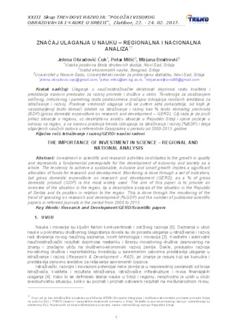 Obradović Ćuk, Jelena and Mitić, Petar and Dmitrović, Mirjana (2017) Značaj ulaganja u nauku : regionalna i nacionalna analiza. In: XXIII skup Trendovi razvoja "Položaj visokog obrazovanja i nauke u Srbiji". Fakultet tehničkih Nauka, Novi Sad, pp. 217-220. ISBN 978-86-7892-904-5