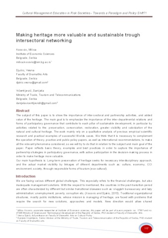 Kočović, Milica and Đukić, Vesna and Vićentijević, Danijela (2016) Making heritage more valuable and sustainable trough intersectoral networking. In: Cultural management education in risk societes : towards a paradigm and policy shift?! :7th Annual research session ENCATC. ENCATC, Brussels, pp. 117-134. ISBN 978-92-990036-5-7