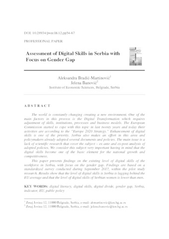 Bradić-Martinović, Aleksandra and Banović, Jelena (2018) Assessment of Digital Skills in Serbia with Focus on Gender Gap. Journal of Women's Entrepreneurship and Education (1/2). pp. 54-67. ISSN 1821-1283