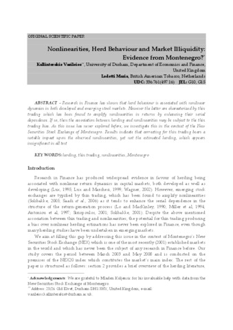 Kallinterakis, Vasileios and Lodetti, Maria (2009) Nonlinearities, Herd Behaviour and Market Illiquidity: Evidence from Montenegro?*. Economic analysis, 42 (3-4). pp. 7-17. ISSN 1821-2573