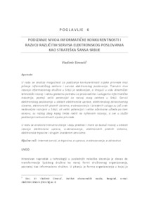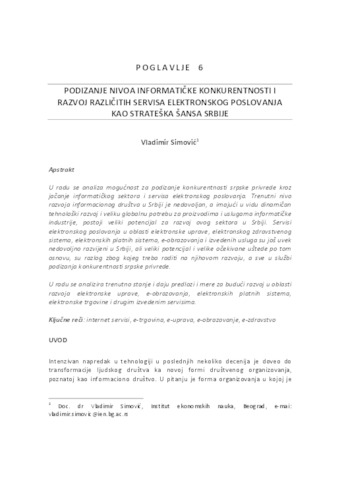 U radu se analiza mogućnost za podizanje konkurentnosti srpske privrede kroz jačanje informatičkog sektora i servisa elektronskog poslovanja. Trenutni nivo razvoja informacionog društva u Srbiji je nedovoljan, a imajući u vidu dinamičan tehnološki razvoj i veliku globalnu potrebu za proizvodima i uslugama informatičke industrije, postoji veliki potencijal za razvoj ovog sektora u Srbiji. Servisi elektronskog poslovanja u oblasti elektronske uprave, elektronskog zdravstvenog sistema, elektronskih platnih sistema, e-obrazovanja i izvedenih usluga su još uvek nedovoljno razvijeni u Srbiji, ali veliki potencijal i velike očekivane uštede po tom osnovu, su razlog zbog kojeg treba raditi na njihovom razvoju, a sve u službi podizanja konkurentnosti srpske privrede.