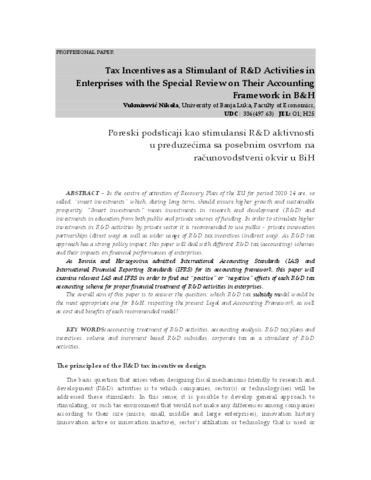 The overall aim of this paper is to answer the question: which R&D tax subsidy model would be the most appropriate one for B&H, respecting the present Legal and Accounting Framework, as well as cost and benefits of each recommended model?