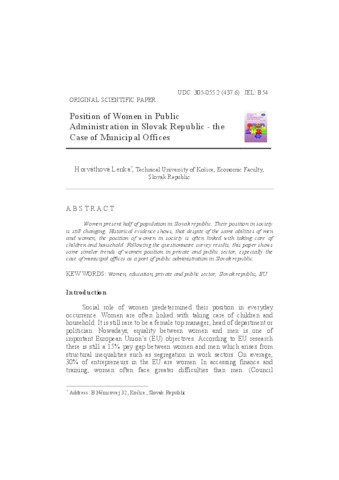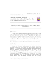 and women, the position of women in society is often linked with taking care of children and household. Following the questionnaire survey results, this paper shows some similar trends of women position in private and public sector, especially the case of municipal offices as a part of public administration in Slovak republic.