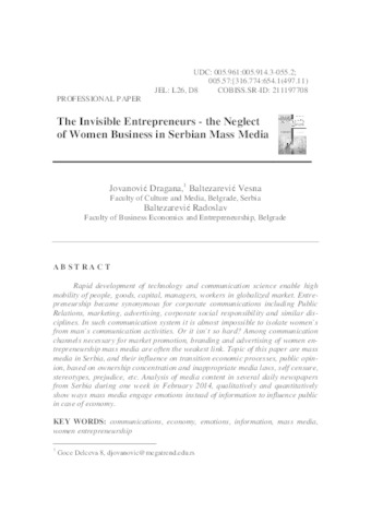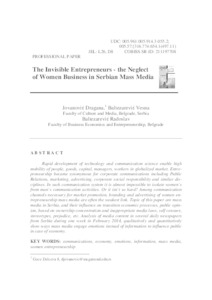 Jovanović, Dragana and Baltezarević, Vesna and Baltezarević, Radoslav (2014) The Invisible Entrepreneurs - the Neglect of Women Business in Serbian Mass Media. Journal of Women's Entrepreneurship and Education (3-4). pp. 71-82. ISSN 1821-1283