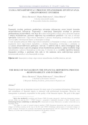 Stevanović, Slavica and Radovanović, Bojana and Minović, Jelena (2011) Uloga menadžmenta u procesu finansijskog izveštavanja - odgovornosti i interesi. In: Majska konferencija o strategijskom menadžmentu: studentski simpozijum o strategijskom menadžmentu. Tehnički fakultet Bor, Zaječar, pp. 639-647. ISBN 978-86-80987-85-9