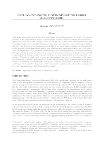 This paper deals with the analysis of the functioning of the labour market in Serbia. The overall situation in the Serbian labour market is deteriorating. However, if the two sub-periods are observed, before and after the recent economic crisis, it can be noticed that some improvements occurred immediately before the crisis. The first improvement that came about was the unemployment decline, and after that the level of employment increased. This in particular affected women, which further led to the narrowing of the employment gender gap. Unfortunately, these improvements were only shortlived. During the post crisis period the situation aggravated, as manifested by a convergence between the employment and unemployment rates of women, whereas the economic activity of women dropped to only half of the female workforce. Similar patterns are also characteristic of both young and older workers. The rates of employment of these two subsamples of the workforce have been at the lowest levels achieved in the last couple of years in Serbia. The increasing levels of unemployment disturb the sectoral distribution of employment. This, jointly with the skill and occupational mismatches, contributes to the further deepening of the structural unemployment. All of these indicate an increasing malfunctioning of the Serbian labour market.