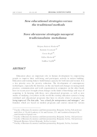 Radović-Marković, Mirjana and Grozdanić, Radmila and Kvrgić, Goran and Marković, Dušan and Vujičić, Slađana (2012) New educational strategies versus the traditional methods. International review, 1 (1/2). pp. 23-32. ISSN 2217-9739